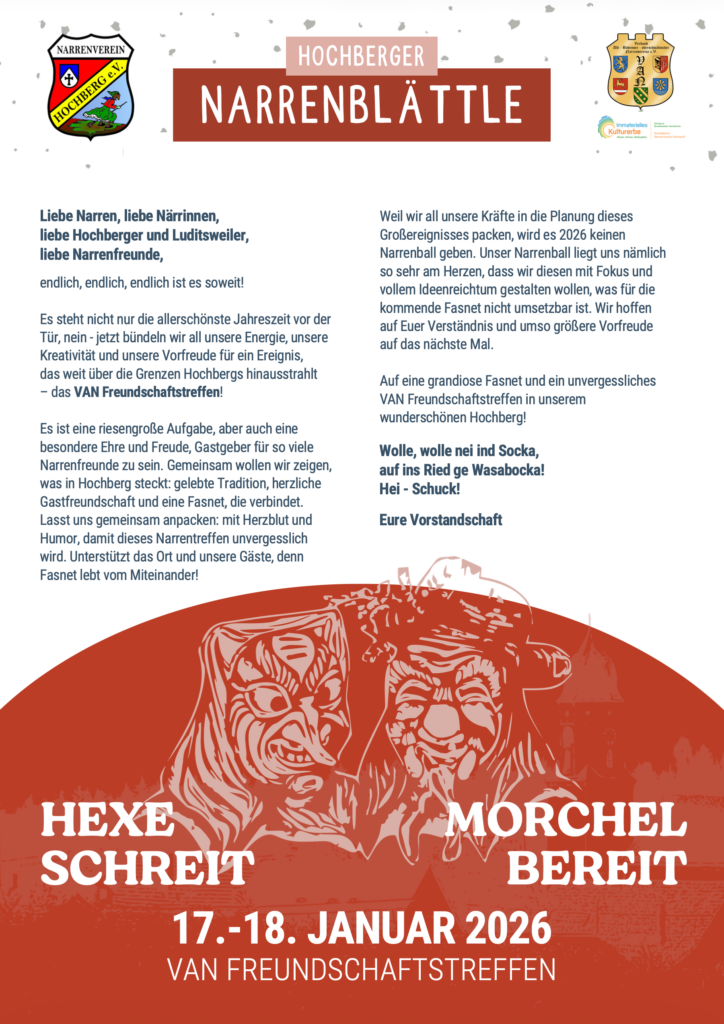 Berichte über die Hauptfasnet und alle Umzüge, oder einfach ein bisschen närrischer Spaß – unser Narrenblättle bietet einen bunten Mix aus Neuigkeiten, Unterhaltung und Fasnetsfreude.