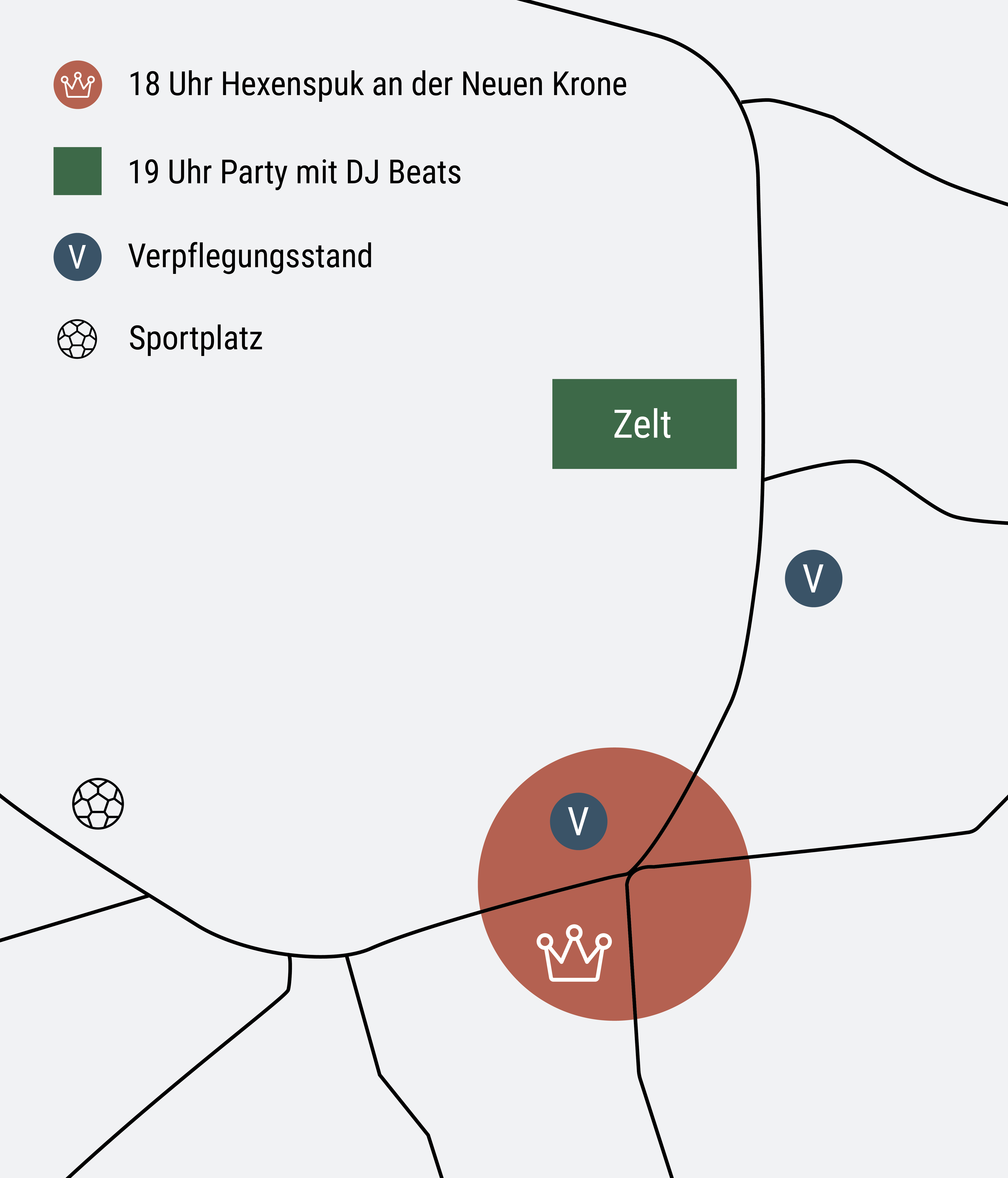 Während des Hexenspuks gibt’s Essen und Getränke an der Neuen Krone sowie gegenüber vom Zelt. Nach dem Hexenspuk nur noch gegenüber und im Zelt.