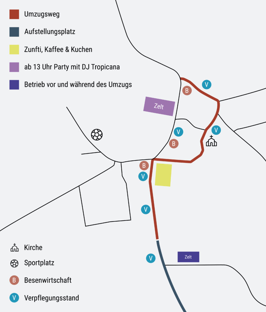 Entlang des Umzugswegs sowie im und vor dem Zelt gibt’s reichlich zu Essen und Trinken. Außerdem erwarten euch verschiedene Besenwirtschaften im Ort. Im Gemeindesaal (Luditsweilerstr. 39) gibt es Kaffe/Kuchen und eine Weinlaube.